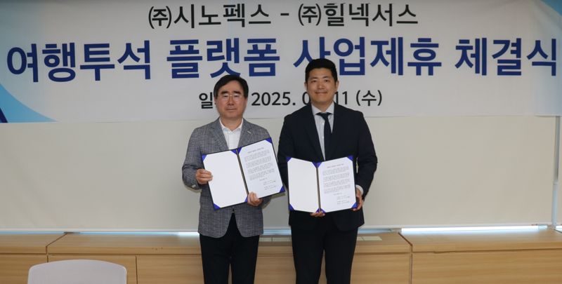 시노펙스 정민재 부사장(왼쪽)과 힐넥서스 진성호 대표가 여행투석 플랫폼 사업제휴 계약을 체결한 뒤 기념 촬영을 하고 있다/사진=시노펙스 제공