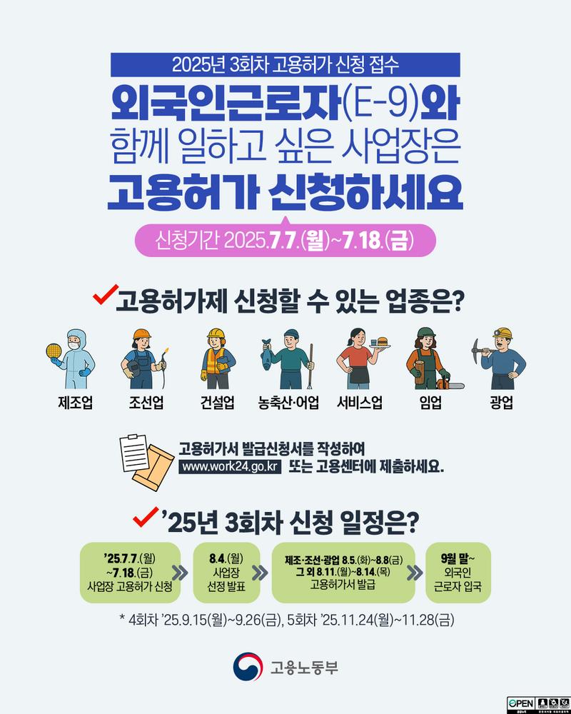 고용노동부가 오는 7월 7일부터 18일까지 외국인근로자(E-9) 제3차 고용허가 신청을 전국 지방고용노동관서를 통해 접수한다고 23일 밝혔다.