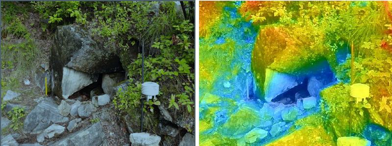 정선 장열리 풍혈지 여름철 열화상 촬영 사진(파란부분일수록 온도가 낮은 지점)/사잔=산림청 제공
