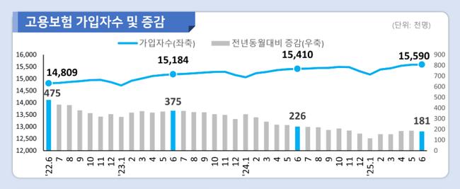 2025년 6월 말 기준 고용보험 상시가입자 수가 1559만명을 기록하며 전년 동월 대비 18만1천명(1.2%) 증가한 것으로 나타났다.