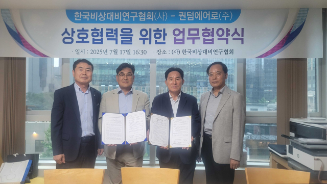 퀀텀에어로와 한국비상대비연구협회가 비상대비분야 효율성 강화 및 연구능력 향상을 위한 업무협약을 체결했다/사진=퀀텀에어로 제공