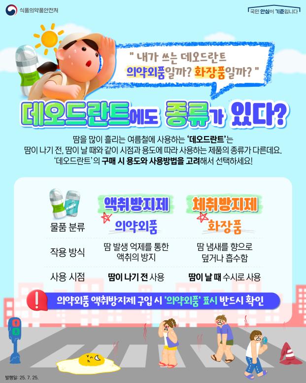 데오드란트, 의약외품일까 화장품일까? 구매 전 꼭 확인하세요! - 여름철 필수품 '데오드란트'…땀 억제용은 ‘의약외품’, - 향으로 덮는 용도는 ‘화장품’ - 해외직구 제품은 안전성 미확인…사용 전 제품 표시·성분 꼼꼼히 확인해야