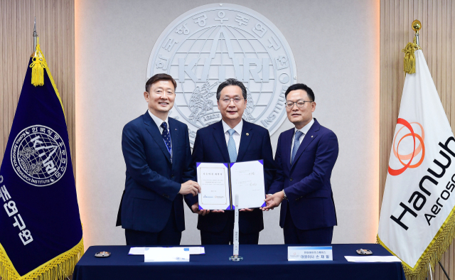 한국항공우주연구원이 한화에어로스페이스와 우주 발사체 ‘누리호’의 전주기 기술 이전 계약을 체결한 후 기념촬영을 하고 있다. 사진(왼쪽부터) 이상철 항우연 원장, 윤영빈 우주항공청장, 손재일 한화에어로스페이스 대표/사진=우주항공청 제공
