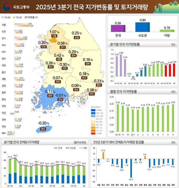 국토부에 따르면 2025년 3분기 전국 지가는 전 분기 대비 0.58% 상승해 2분기(0.55%)보다 상승폭이 0.03%포인트 확대됐다. 다만 지난해 같은 기간(0.59%)에 비해서는 0.01%포인트 낮았다.