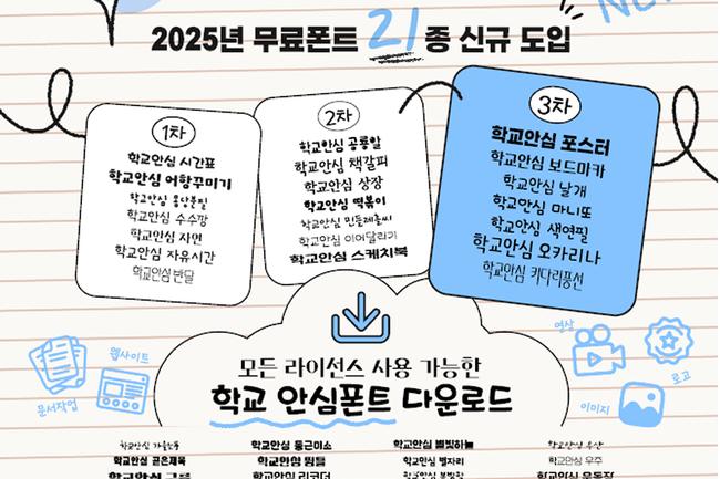 이번 추가 보급으로 학교 안심폰트는 총 65서체 88종으로 확대되며, 전국 학교에서 수업자료, 안내문, 행사 안내 등 다양한 교육자료 제작에 폭넓게 활용할 수 있게 된다.