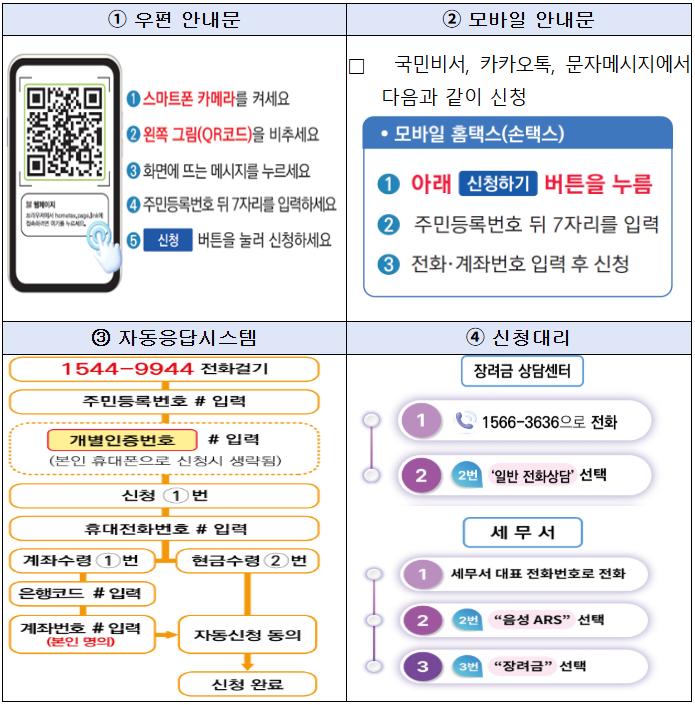 신청은 안내문에 있는 QR코드 또는 자동응답시스템을 통해 가능하다. 고령자 등은 장려금 상담센터나 세무서를 통해 신청대리도 요청할 수 있다.