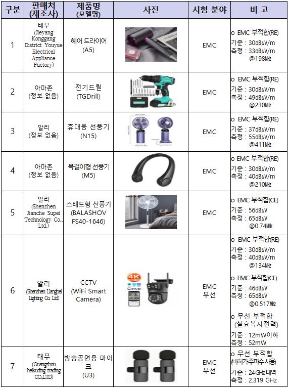 검사 결과, 헤어드라이어, 전기드릴, 휴대용 선풍기, 목걸이형 선풍기, 스탠드형 선풍기, 무선 마이크, 폐쇄회로텔레비전(CCTV) 등 7개 제품이 전파 안전성 기준을 충족하지 못한 것으로 나타났다.