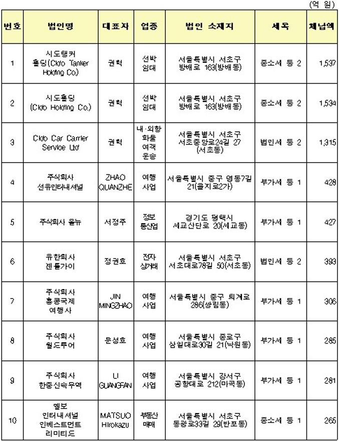 고액・상습체납자 신규 명단공개 대상자(체납액 상위 법인 10위)/자료제공=국세청