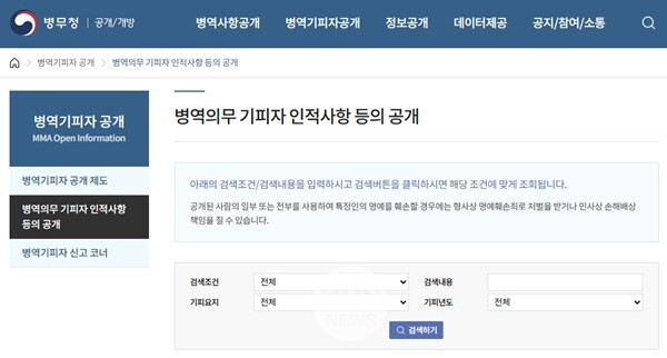 병무청은 병역의무를 기피한 343명의 인적사항 등을 병무청 누리집을 통해 공개했다고 밝혔다. 공개 내용은 병무청 누리집 내 ‘공개·개방포털’의 ‘병역기피자 조회’ 메뉴에서 확인할 수 있다.