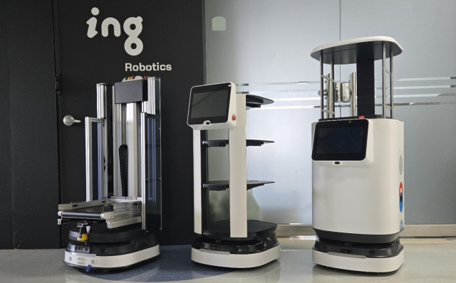 아이엔지로보틱스 본사 앞에 전시된 자율주행 로봇(AMR) 제품 라인업. 왼쪽부터 물류 AMR, 서빙 AMR, 배송 AMR로 구성돼 있으며, 다양한 산업·서비스 현장에 적용 가능한 로봇 솔루션을 제공하고 있다.