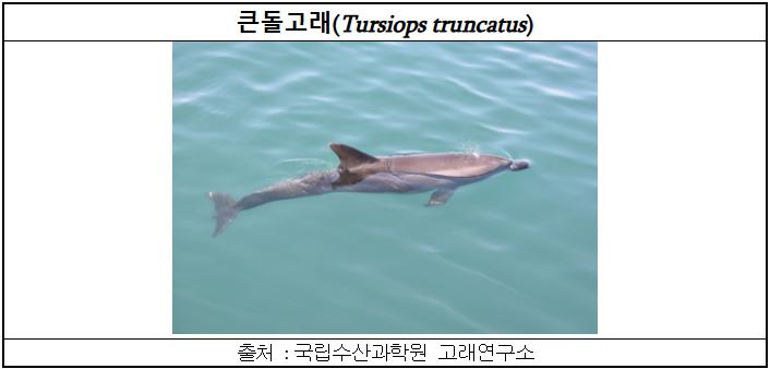 이달의 해양생물로 선정된 큰돌고래(Tursiops truncatus)는 몸길이 약 2.5m, 체중 약 250kg에 이르는 돌고래로, 우리나라 해역에 서식하는 돌고래류 가운데 몸집이 가장 커 ‘큰돌고래’라는 이름이 붙었다.