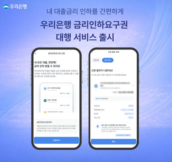 우리은행은 26일 마이데이터를 활용해 여러 금융기관의 대출을 한 번에 조회하고 금리인하요구권까지 신청할 수 있는 ‘금리인하요구권 대행 서비스’를 우리WON뱅킹 앱에 출시한다고 밝혔다.
