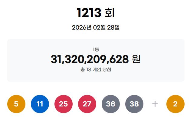 로또복권 운영사 동행복권이 2월 28일 추첨한 제1213회 로또복권에서 당첨번호 6개를 맞힌 1등 당첨은 총 18게임으로 집계됐다.