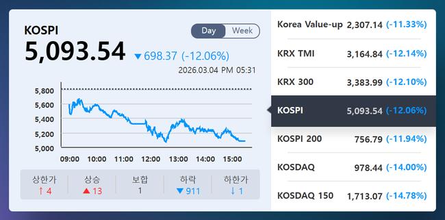 이날 코스피 지수는 5,093.54로 전 거래일 대비 698.37포인트(−12.06%) 하락했다. 거래량은 약 16억2천만주, 거래대금은 약 62조6천억원을 기록했다. 시가총액은 약 4194조9천억원 수준으로 축소됐다.