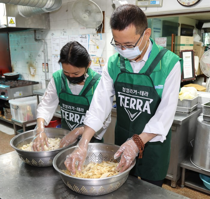 | ▲ 8월 11일 하이트진로 임직원들이 삼계탕을 100인분을 직접 만들어 나눔활동을 펼쳤다. |