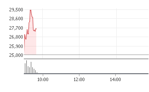 9시에 열린 장은 현재 시각 9시 45분 약 12% 급등하는 시장의 반응을 얻어내고 있다.