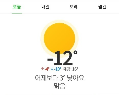 어제 최저기온이 영하 9.6도를 기록한데 이어 오늘은 영하10.4도를 기록했으며 낮 최고기온도 불과 영하4도정도로 예측 하고 있다.