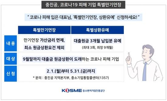 [경제&=김지영 기자] 중소벤처기업진흥공단은 코로나19로 피해를 입은 기업들을 대상으로 9월 30일로 만기가 되는 대출에 대한 특별만기연장 및 특별상환유예를 실시한다고 밝혔다.