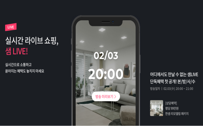 작년 2월부터 다양한 온라인 유통 플랫폼에서 총 10여회 라이브방송 진행해 방송 당 평균 시청자 수가 1만명 넘겼다. 이에 한샘은 자체 채널 ‘샘LIVE’를 통해 방송한다.