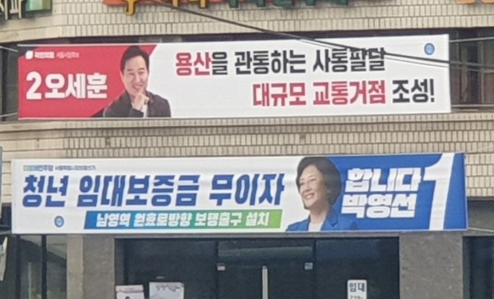 ▲ 숙대입구역 앞에 선거운동을 알리는 현수막이 걸려 있다.