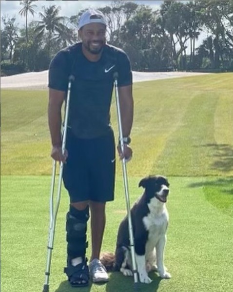 밝은 모습으로 웃는 목발 짚은 타이거우즈