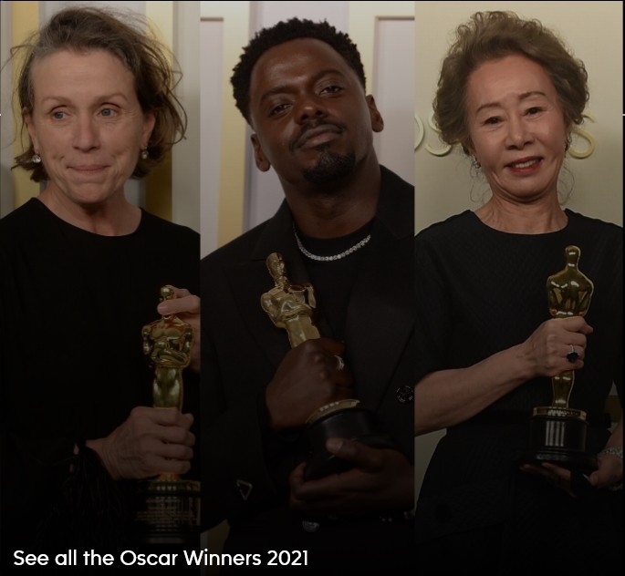 ▲ 오스카 홈페이지를 장식한 여우조연상 수상자 윤여정과 프란시스 맨도맨드(여우주연상), 다니엘칼루야(남우주연상)