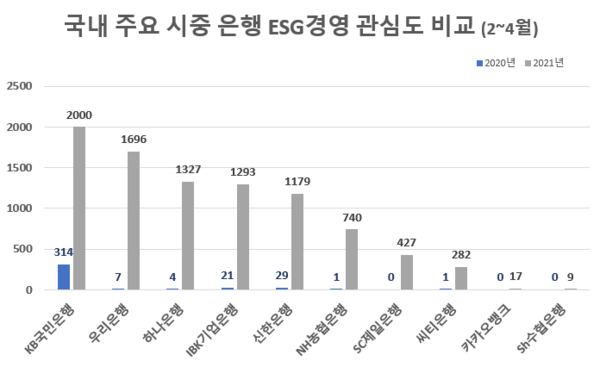 분석 결과 ESG경영 관심도 가장 높은 은행은 'KB국민은행'으로 2년 연속 1위를 기록하며, 지난해부터 관심을 기울여온 것으로 나타났다.