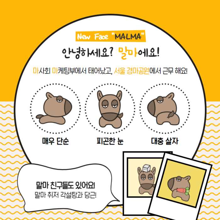 이번 캐릭터는 반쯤 감긴 피곤한 눈을 한 캐릭터로 누구나 쉽게 그릴 수 있게 만들었다. 이름은 ‘말마(MALMA)’로 한문 馬가 떠오를 만큼 이름도 단순하다.