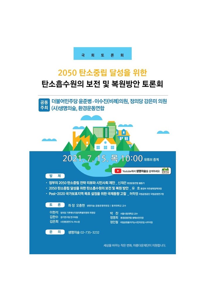 [경제&=양순미 기자] (사)생명의숲은 15일 ‘2050 탄소중립 달성을 위한 탄소흡수원 보전 및 복원 방안 토론회’를 더불어민주당 윤준병의원, 이수진(비례)의원, 정의당 강은미의원과 환경운동연합 참여하는 토론회를 개최했다고 밝혔다.