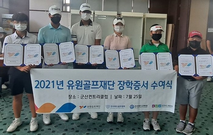 | ▲ 유원골프재단은 ‘제35회 전라북도골프협회장배 학생골프 선수권대회’, ‘제5회 전라북도교육감배 학생골프선수권대회’의 성적을 통해 선발된 전북 지역 골프 유망주들에게 장학금을 전달했다. |