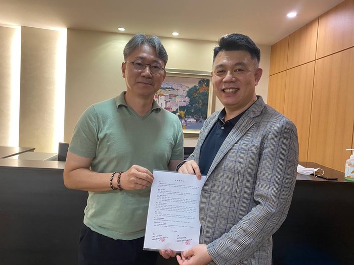 | ▲ 주식회사 뷰티베이커리 김학식 대표(우)와 주식회사 제니스씨앤엠 강준 대표(좌)가 7월 27일 주식 양수도 계약을 체결하고 기념사진을 촬영하고 있다. |