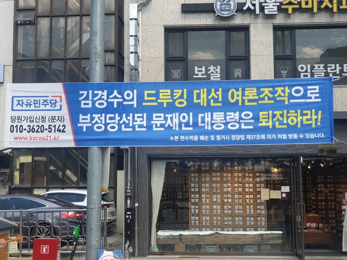 ▲ 드루킹 관련 문재인 대통령 퇴진 현수막이 걸려있다