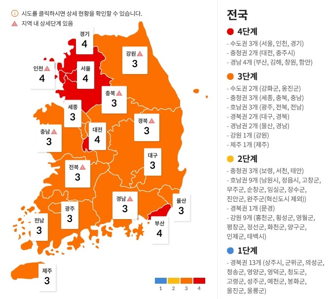 | ▲ 코로나19 지역별 적용 단계 / 8월 11일 질병관리청 홈페이지 |