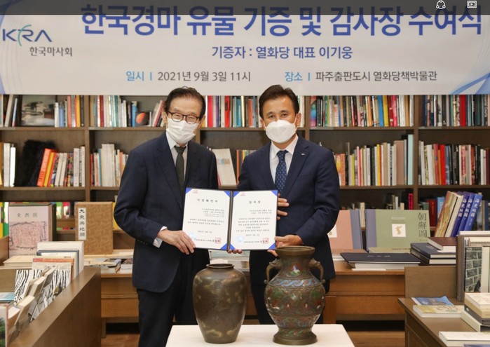 기증식에는 한국마사회 송철희 회장 직무대행과 도서출판 열화당 이기웅 대표가 참석했다. 직무대행 송 회장은 감사의 표시로 이 대표에게 감사장을 수여했다.