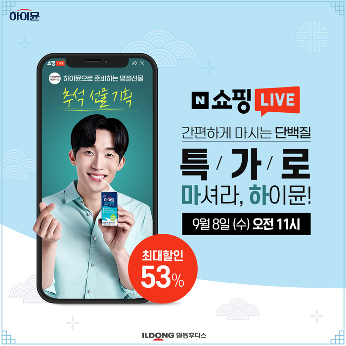 이번 ‘네이버 쇼핑 라이브’에서는 8일 오전 11시 1시간 동안 ‘추석 라이브 기획전’을 통해 ‘하이뮨 프로틴 밸런스 음료’를 판매할 예정이다.