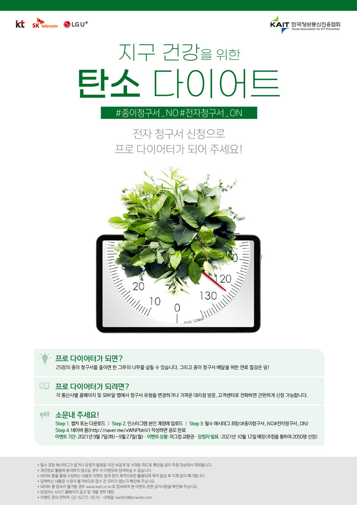[경제&=홍지민 기자] KT가 한국정보통신진흥협회(KAIT), SK텔레콤, 엘지유플러스와 함께 ‘지구 건강을 위한 탄소 다이어트, 종이청구서 줄이기’ 캠페인을 진행한다고 7일 밝혔다.