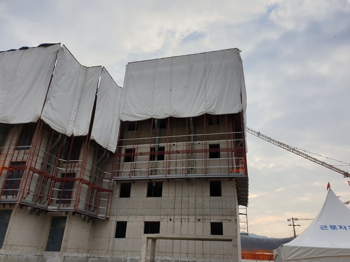 공동주택 현장에 타워크레인으로 수동 인양되는 갱폼을 레일을 기반으로 유압 인양 자동화 시스템을 적용 강풍 사고 예방하며, 공기 지연 방지에도 도움인 된다.
