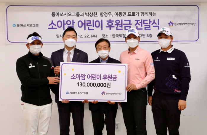 | ▲ 후원 프로골프 선수들과 함께 한국백혈병어린이재단 기부금 전달 <사진=동아쏘시오그룹> |