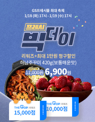 프레시빅데이 행사 기간 구매 금액에 따라 현금처럼 사용할 수 있는 GS리테일 전용 포인트 ‘더팝 리워즈’를 제공한다.