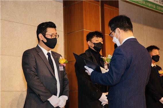 | ▲김지현 선임(왼쪽), 국토부장관상 수상, 김흥진(오른쪽) 국토교통부 국토도시실장이 수여하고 있는 모습 |