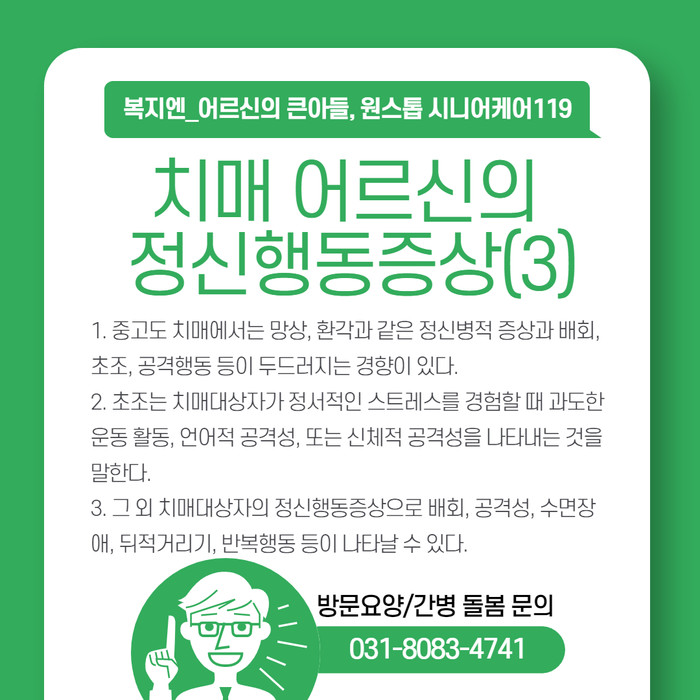 어르신의 정신행동증상은 치매로 인해 비현실적인 생각, 조절되지 않는 기분, 현실에서는 존재하지 않는 사물에 대한 자각이나 부적절한 여러 행동으로 나타난다고 지난 시간에 나누었습니다. 그래서 결국 치매는 의심과 망상 등 뇌손상에 의한 병적 증상으로 어르신들이 일부러 하는 행동이 아닌거지요. 그래서 이번 시간에는 초기 증세보다는 중증으로 넘어갈 때 생기는 치매 어르신의 다양한 정신행동증상이 어떤 것이 있는지 함께 살펴보면 좋겠습니다.