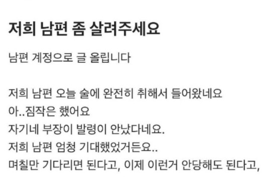 [경제&=인원균 기자] 익명 커뮤니티 '블라인드'에 어처구니 없는 사연이 올라왔다. 제목은 '우리 남편을 살려주세요'라는 제목으로 글이 올라왔다.