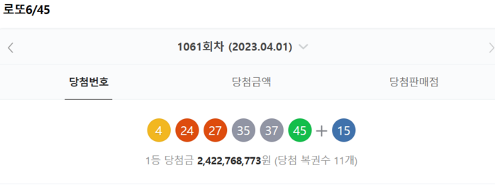 1등 당첨번호는 '4, 24, 27, 35, 37, 45번'으로 1인당 24억 2,276만원씩의 당첨금을 수령한다.