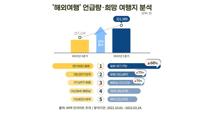 빅데이터 콘텐츠 구독 플랫폼 서비스인 KPR 인사이트 트리에 의하면 해외여행에 관한 온라인상 언급량은 2022년 10월부터 2023년 3월까지 6개월간 약 57만 건을 기록했다. 특히 2023년 1분기 언급량은 약 32만건으로 2022년 4분기 대비 25% 증가해 그동안 해외여행에 대해 느꼈던 갈증을 반영했다.
