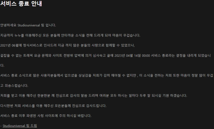 도미니카 공화국에 서버를 두고 불법으로 운영되었던 누누티비는 공지를 통해 “지금까지 누누를 이용해주신 모든 분들께 안타까운 소식을 전해 드리게 되어 마음이 무겁다”면서 “걷잡을 수 없는 트래픽 요금 문제와 사이트 전방위 압박에 의거 심사숙고 끝에 2023년 04월 14일 00:00 서비스 종료라는 결정을 내리게 됐다”고 밝혔다