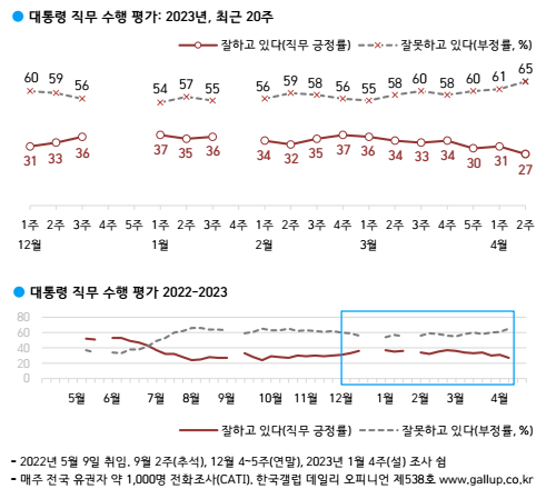한국갤럽이 지난 11∼13일 전국 만 18세 이상 1002명을 대상으로 조사한 결과, 윤 대통령의 직무수행 긍정평가는 27%, 부정평가는 65%로 나타났다고 14일 밝혔다.