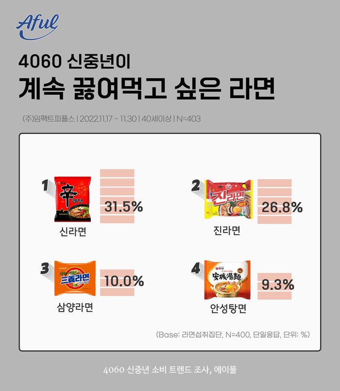 이번 조사는 임팩트피플스가 에이풀(Aful)을 통해 2022년 11월 17일부터 11월 30일까지 4060 신중년 남녀 403명을 대상으로 라면 구매 트렌드를 알아보고자 진행했다.