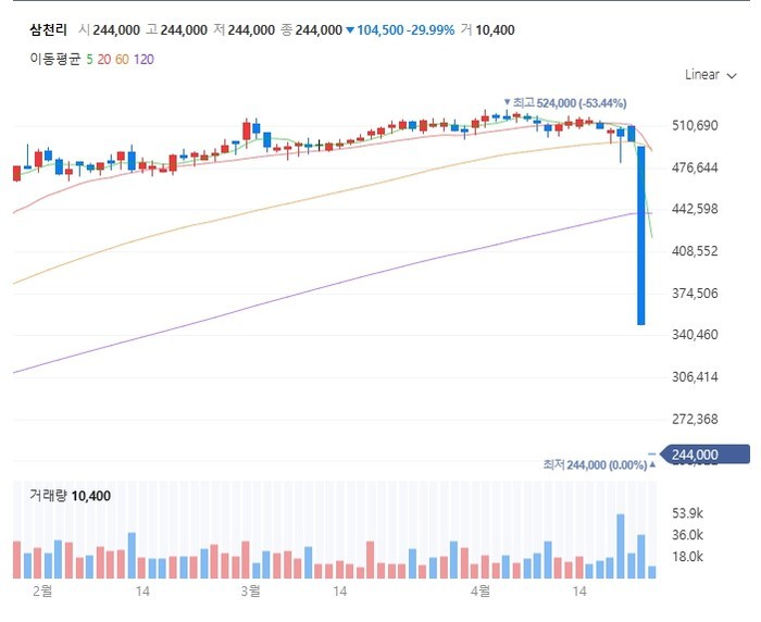 | ▲ 삼천리 주가 급락 / 네이버 화면 캡쳐 |
