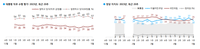 윤석열 대통령 국정 운영 지지도가 미국 국빈방문과 한미정상회담 성과 등으로 소폭 상승했고, ‘2021년 전당대회 돈 봉투 의혹’의 여파로 더불어민주당의 지지도가 직전 조사보다 4%P 하락하며 7주 만에 국민의힘에 뒤처진 것으로 나타났다.