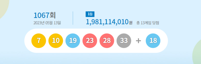 로또복권 운영사 동행복권이 5월 13일 추첨한 제1067회 로또복권에서 당첨번호 6개를 맞힌 1등 당첨자는 모두 13명으로 집계됐다.